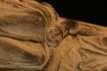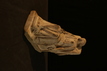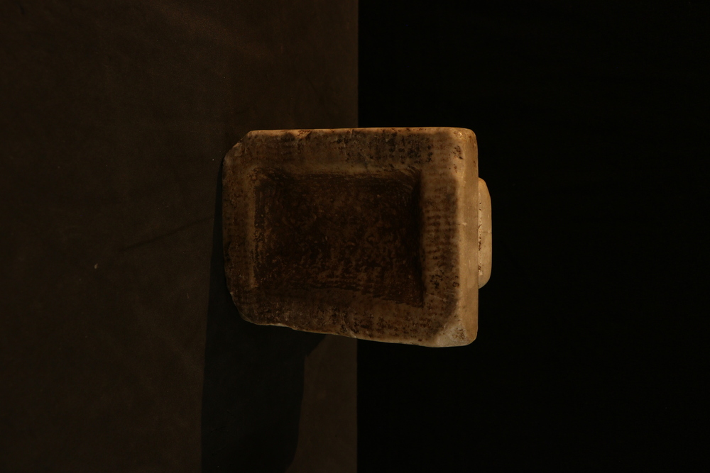 2025.97.0056.jpg | View of the bottom of a small marble statuette of a seated female, showing the base, with anathyrosis.