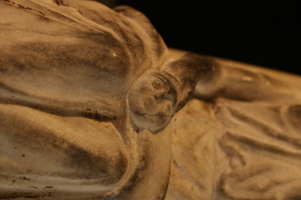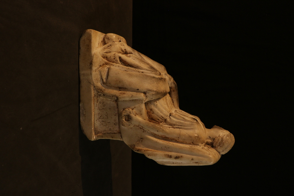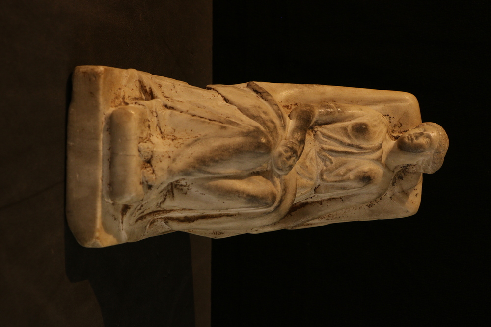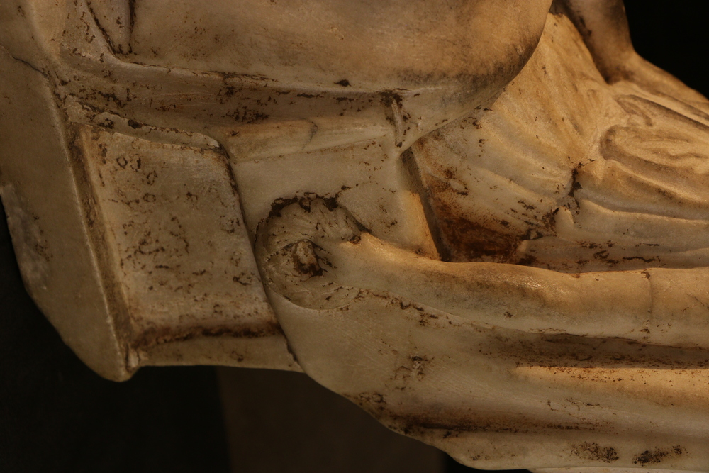 2025.97.0058.jpg | Detail view of a small marble statuette of a seated female, showing the wreath in her lowered left hand.
