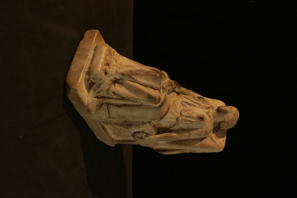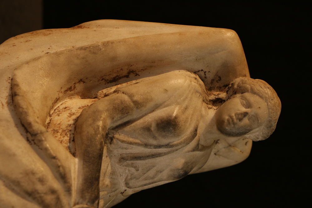 2025.97.0059.jpg | Detail view of a small marble statuette of a seated female, showing a mask in her lap.