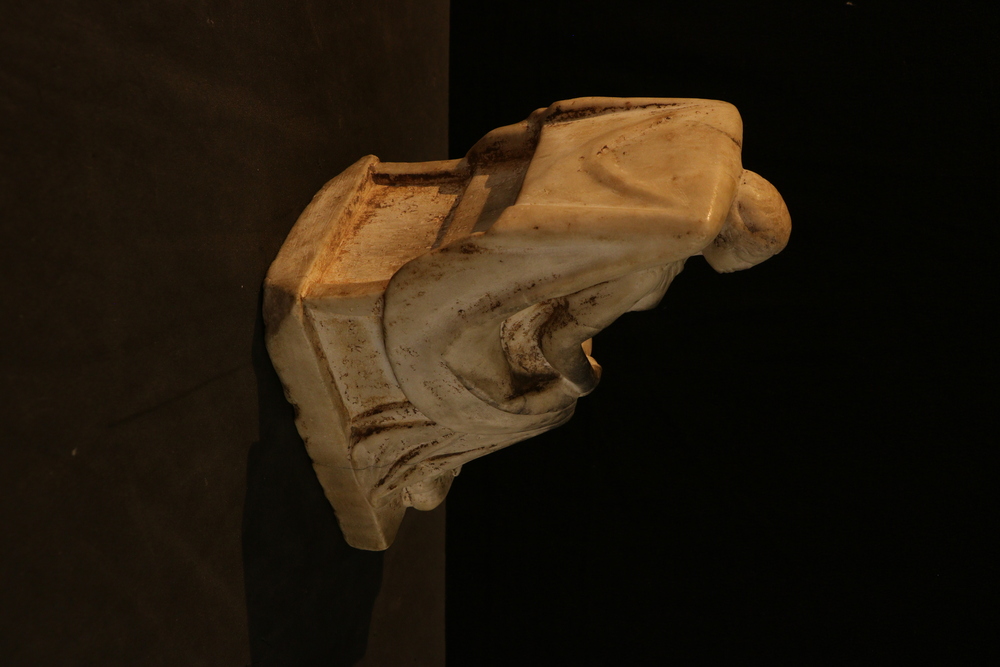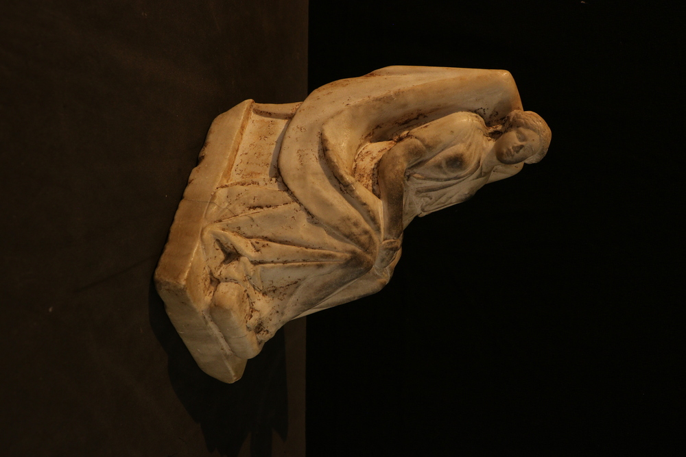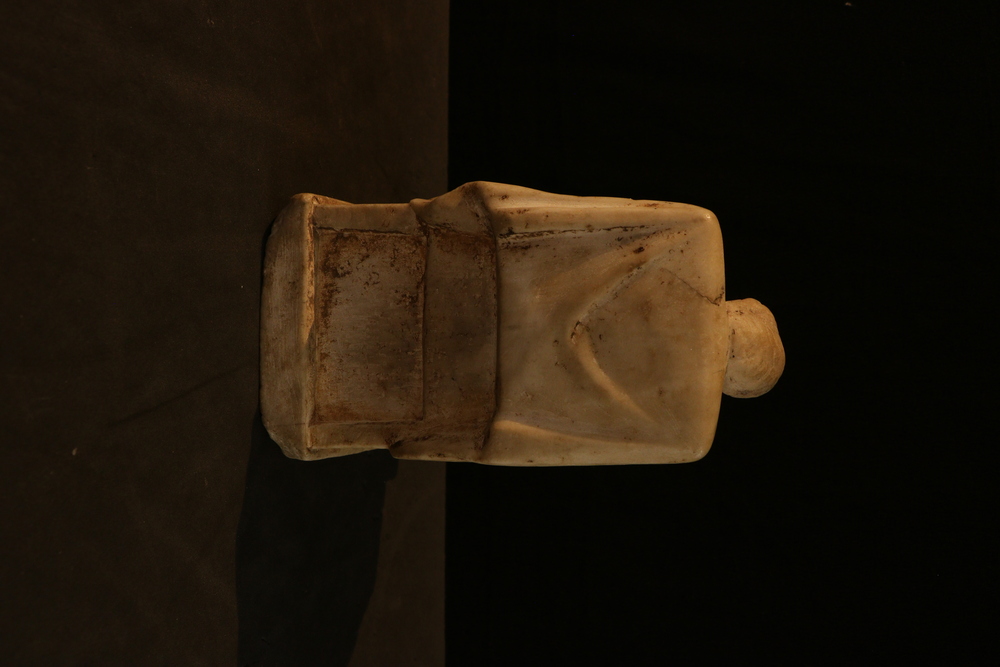 2025.97.0057.jpg | Detail view of a small marble statuette of a seated female, showing her face and upper body.