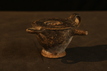 2025.97.0018.jpg | Oblique view of the back of an Attic black-glazed feeder, showing the vertical and horizontal handles but not the spout.
