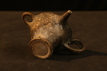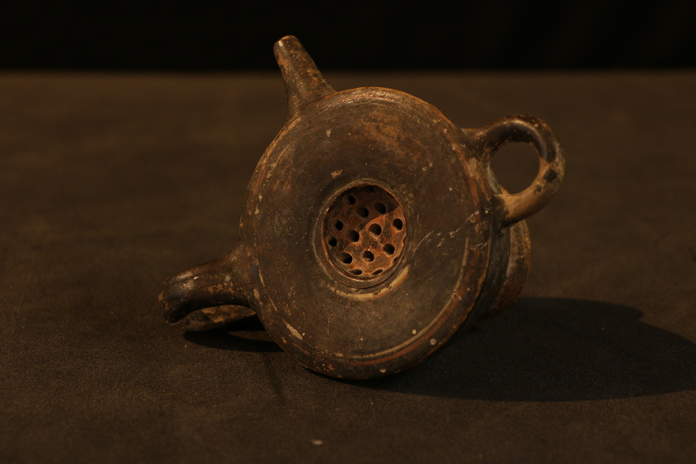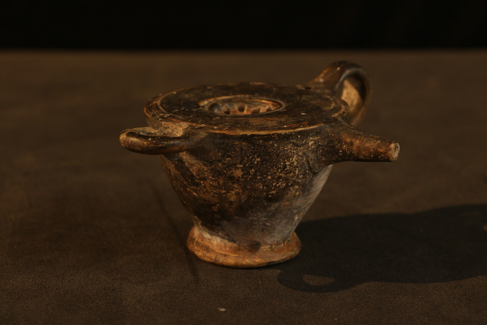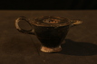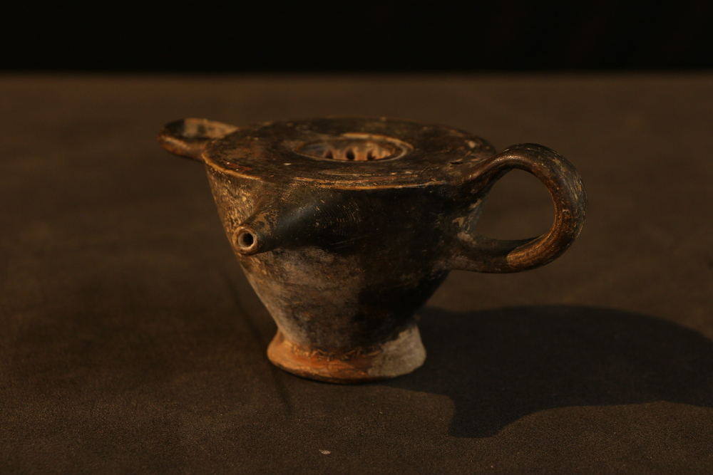 2025.97.0017.jpg | Oblique view of an Attic black-glazed feeder, showing the spout and the vertical handle.