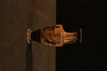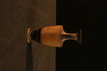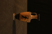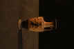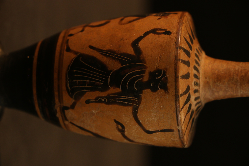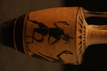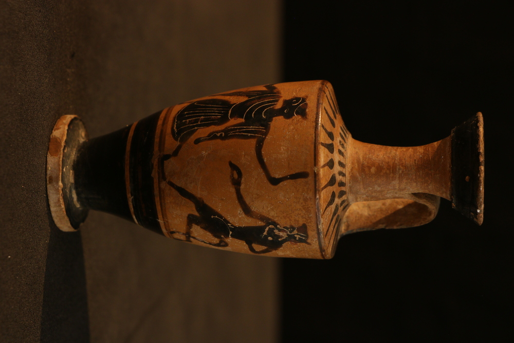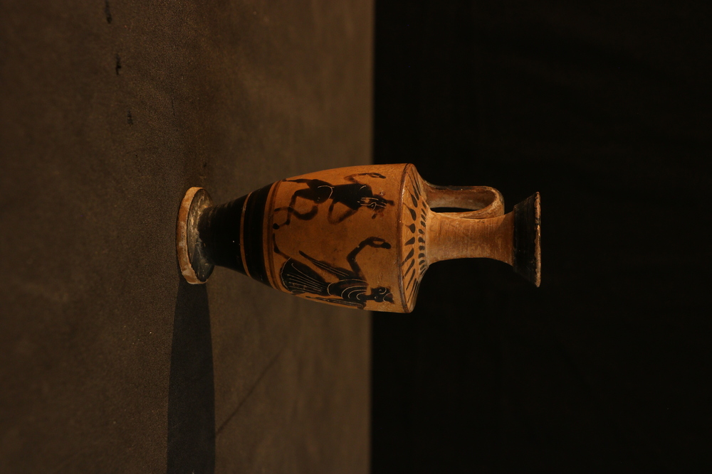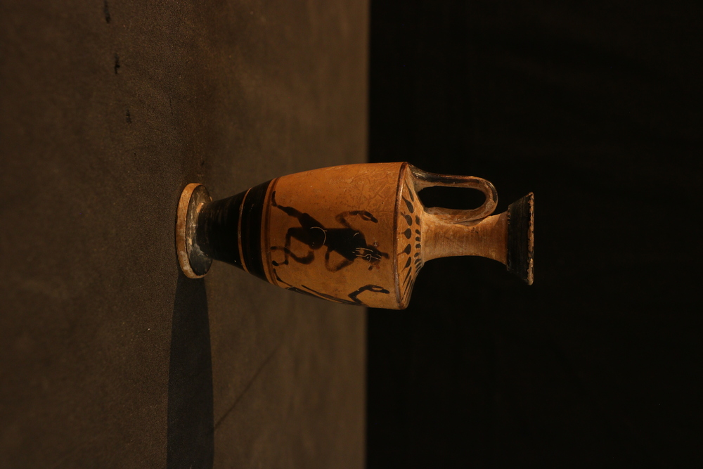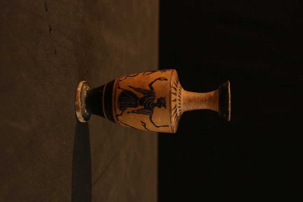 2025.97.0023.jpg | Profile view of the left side of an Attic black-figure lekythos, decorated with a satyr, showing the handle.